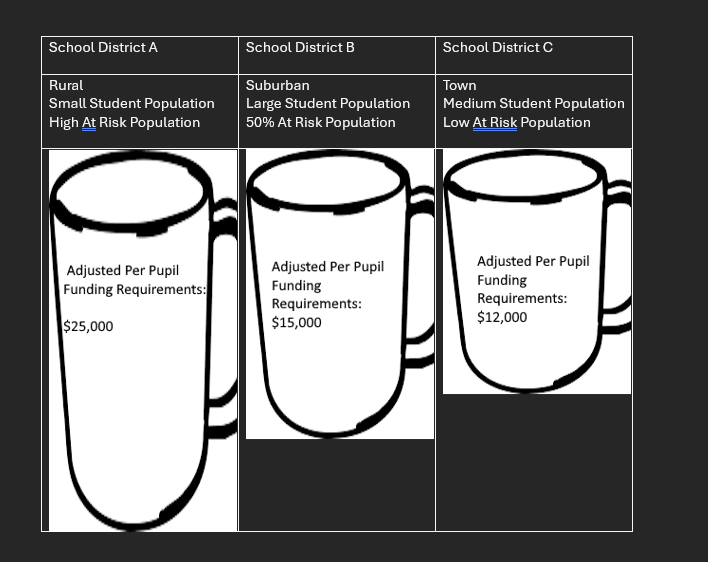 Before you have a knee jerk reaction to the $25,000 amount, please note that School District A is extremely small. It could likely have 100 students. That means the funding need is $25,000.